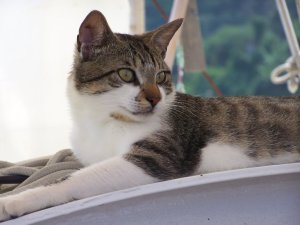 Mittlerweile ist der Kater kastriert, hat Papiere und fühlt sich bei uns an Bord so wohl, das die "Landgänge" nicht außer Sichtweite stattfinden. Unseren Rhytmus hat er übernommen und kuschelt sich Nachts zwischen uns. Fliegende Fische sind sein Lieblingsfrühstück und natürlich mag er Fleisch! Und wir sind glücklich über unseren neuen Kuschelkater und versuchen ihn zu mästen.